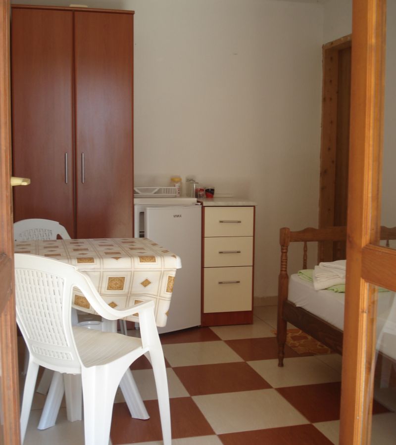 Accommodation type: room (10 m2), 1/2. Structure: bedroom with dining table and fridge, mini stove with oven, wardrobe, bathroom. Sleeping capacity: up to 2 person [one sofa-bed] and one bed more (90 cm). View: inland view (I/V). Air-conditioning: no (portable ventilator). TV: no (radio - yes, wireless Internet - yes). Wireless Internet: yes.